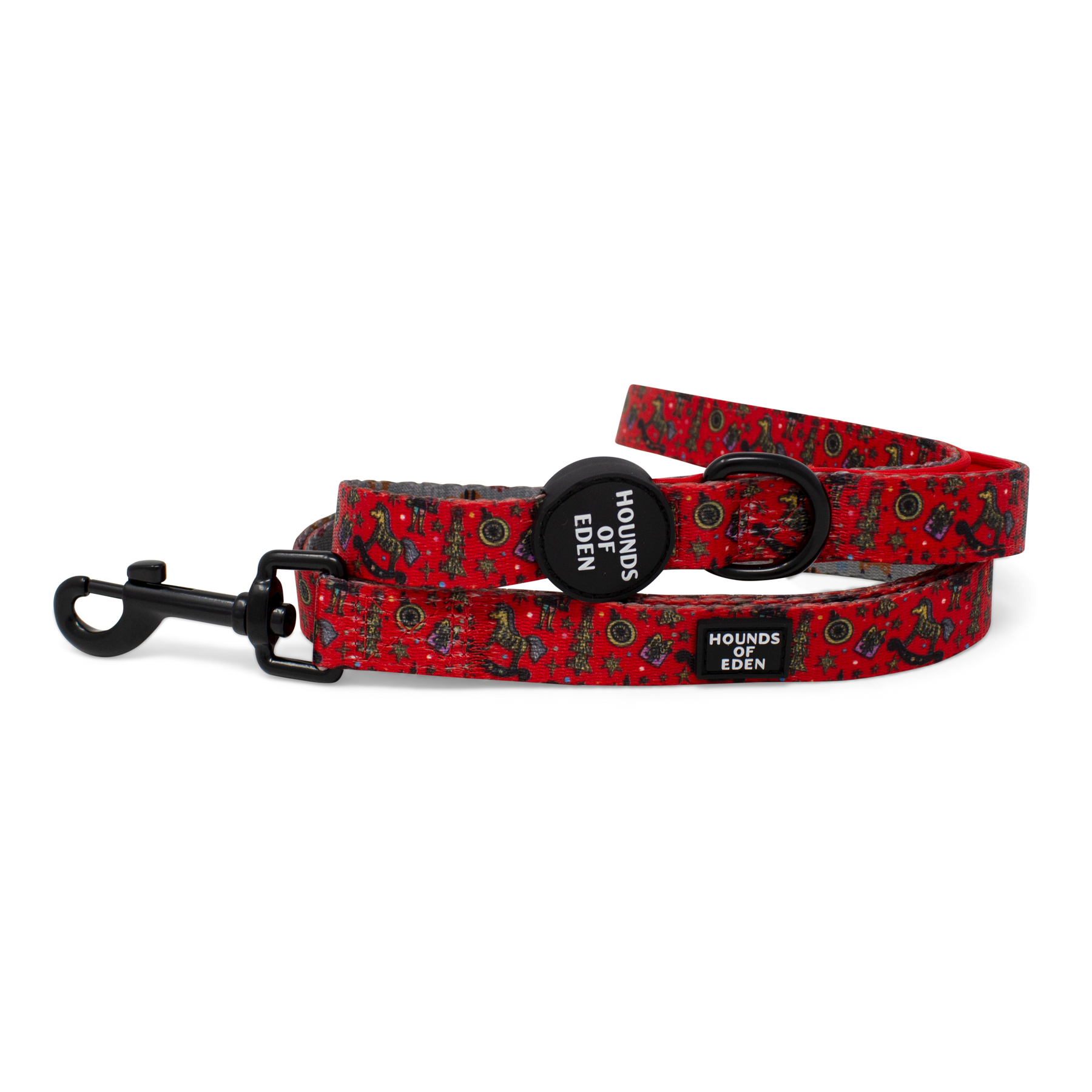 El arnés navideño definitivo: un diseño divertido y festivo inspirado en la historia de El Cascanueces. Bailarinas, caballitos, ratones, cascanueces y todo lo relacionado con la Navidad adornan este elegante diseño rojo, con toques de nuestro característico rosa + azul.
